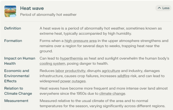 Heatwaves are periods of abnormally hot weather, often accompanied by high humidity, lasting from several days to months. They are considered extreme weather events and pose significant dangers to human health, agriculture, and infrastructure. Heatwaves are measured relative to the usual climate of the area and average temperatures for the season, meaning what is considered a heatwave in one region might not be in another. The intensity and frequency of heatwaves have increased across almost every area on Earth since the 1950s, primarily due to climate change. This increase is attributed to the strengthening and prolonged presence of high-pressure areas in the upper atmosphere over regions which trap heat near the Earth's surface.